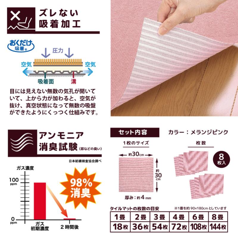 [サンコー]おくだけ吸着 撥水タイルマット メランジピンク 8枚入