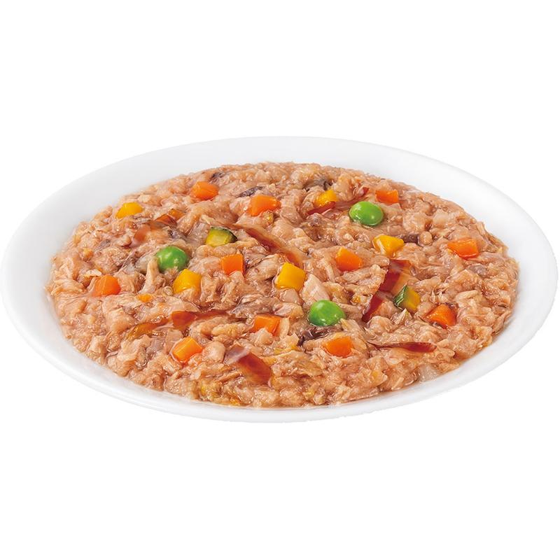 素材 | <原材料> まぐろ、かつお、野菜類(人参、かぼちゃ、グリンピース)、かつお節、でん粉類、寒天、増粘多糖類、ビタミンE、紅麹色素、緑茶エキス <保証成分> たんぱく質5.0%以上、脂質0.1%以上、粗繊維0.4%以下、灰分0.9%以下、水分94.0%以下 <エネルギー> 約15kcal/袋 |