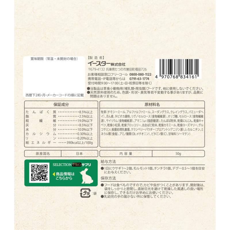 | 注意事項 | ・当製品は草食小動物用(哺乳類・爬虫類)フードです。他に使用しないでください。 ・天然原料使用のため、色調・形状・臭気等若干変動することがありますが、品質に問題はありません。 |
