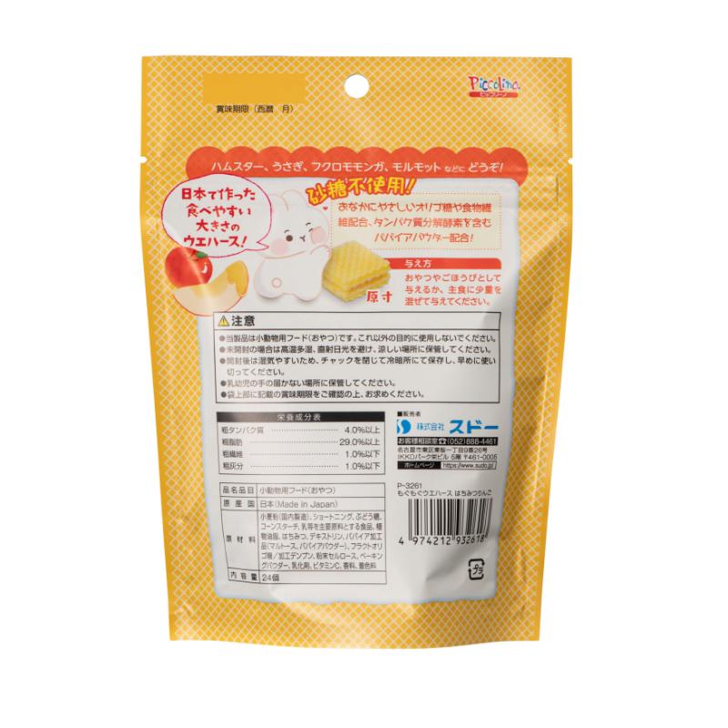 注意事項 | ・当製品は小動物用フード(おやつ)です。これ以外の目的に使用しないでください。 ・パッケージ裏面の注意書きをよく読んでご使用ください。 |