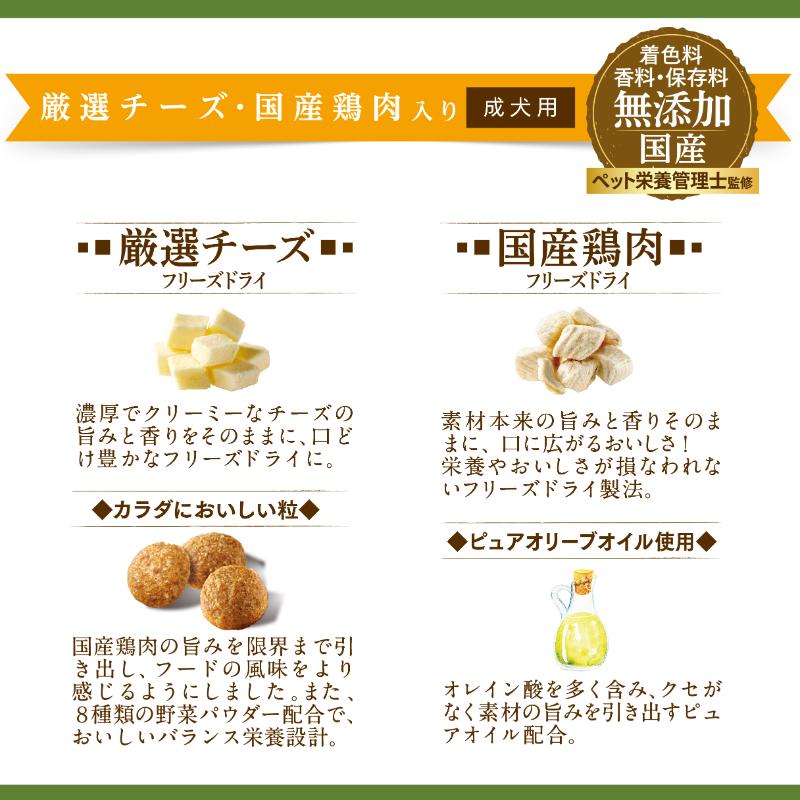 ・素材そのまま、栄養も損なわれない国産鶏肉フリーズドライと、クリーミーな味わいと深みあるコクをより感じられる厳選チーズのフリーズドライをトッピング。