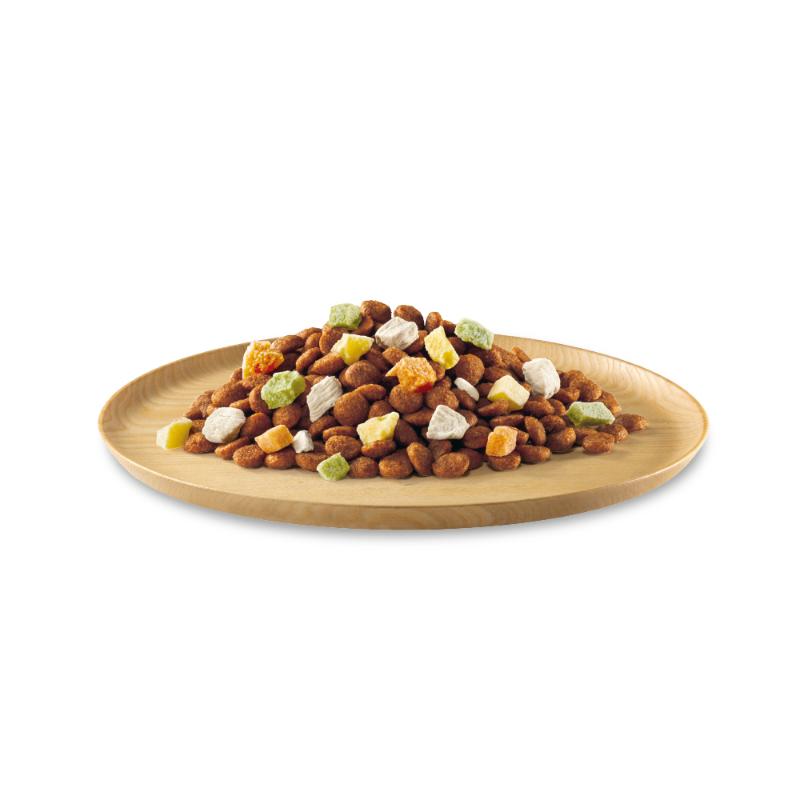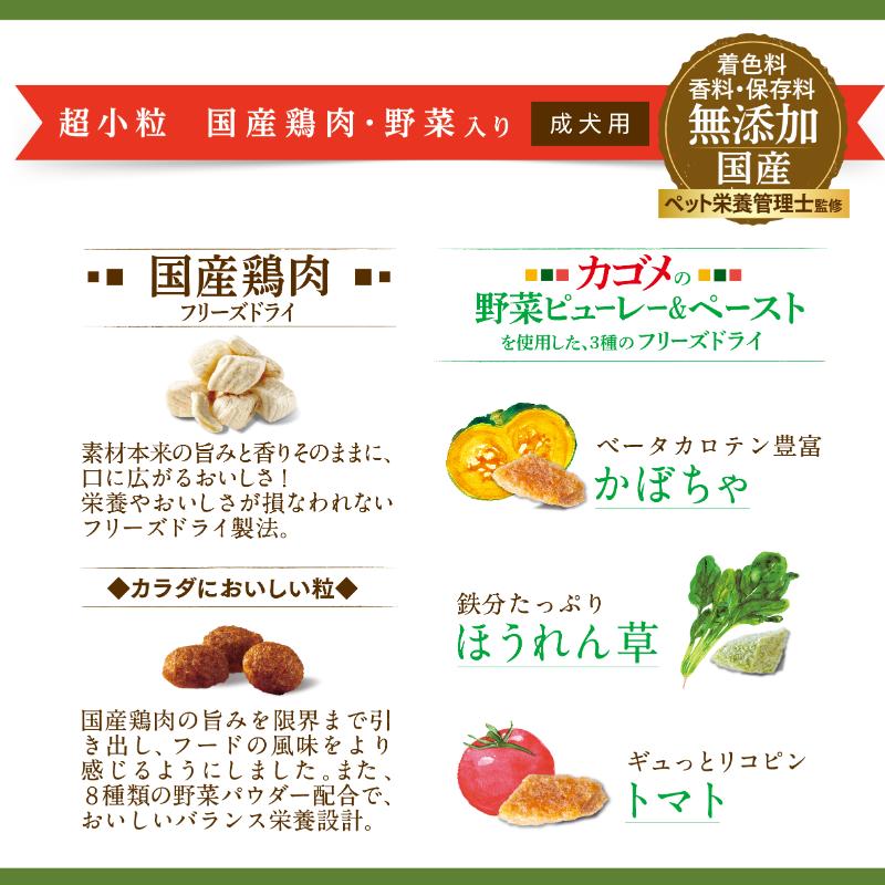 食べやすい超小粒。素材のおいしさと栄養がとれる、国産鶏肉と野菜ピューレーフリーズドライ入り