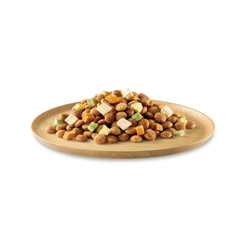 | 素材 | <原材料> 穀類(トウモロコシ、小麦ブラン、ライスブラン、コーンフラワー、コーングルテンフィード)、肉類(チキンミール、牛肉粉、豚肉粉、チキンレバーパウダー)、豆類(脱脂大豆、おから粉末)、油脂類(動物性油脂、植物性油脂(ピュアオリーブオイル含む))、乳類(フリーズドライチーズ、チーズパウダー)、野菜類(カボチャピューレー、トマトペースト、ホウレンソウピューレー、キャベツパウダー、大麦若葉パウダー、カボチャパウダー、トマトパウダー、ニンジンパウダー、ブロッコリーパウダー、ホウレンソウパウダー、モロヘイヤパウダー)、ゼラチン、でん粉類(でん粉、デキストリン)、麹菌発酵物、セレン酵母、小魚粉末、コエンザイムQ10、オリゴ糖、カゼインホスホペプチド、ミネラル類(カルシウム、リン、ナトリウム、クロライド、鉄、銅、マンガン、亜鉛、ヨウ素、コバルト)、ビタミン類(A、B2、B6、B12、D、E、パントテン酸、コリン)、酸化防止剤(ビタミンE、ローズマリー抽出物)、グルコサミン、アミノ酸類(アルギニン、メチオニン)、コンドロイチン <保証成分> たんぱく質19.5%以上、脂質10.0%以上、粗繊維5.0%以下、灰分9.0%以下、水分10.0%以下、カルシウム0.8%以上、リン0.7%以上、リノール酸1.0%以上 <エネルギー> 350kcal/100g |