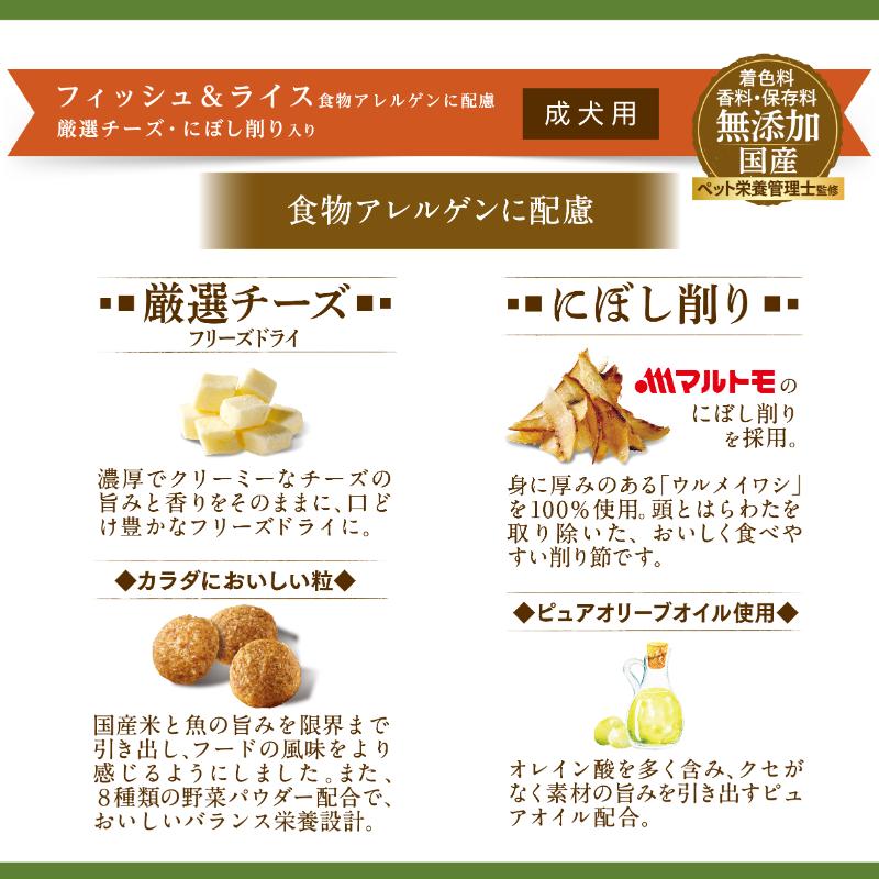 | 注意事項 | ・本商品は成犬以上が対象です。子犬(12ヵ月まで)には子犬用フードをお与えください。 ・犬専用に栄養バランスを調整しています。犬以外には与えないでください。 ・天然素材パウダーをコーティングしていますので、粒の色調は若干バラつく場合があります。また具材の色、形、大きさに若干のバラつきがありますが、品質に問題ありません。 ・にぼし削りが崩れやすい為、粒が目立つことがありますが、品質に問題ありません。 ・商品の酸化を防ぎ品質を保つ為、脱酸素剤を封入しています。開封後は効果がなくなりますので、誤飲を防ぐため先に捨ててください。 |