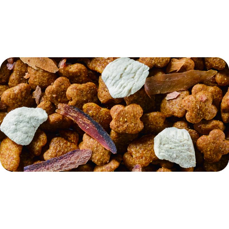 | 素材 | <原材料> 穀類(トウモロコシ、コーングルテンミール、小麦粉、パン粉)、肉類(チキンミール、牛肉粉、豚肉粉、フリーズドライ鶏肉、チキンレバーパウダー)、魚介類(フィッシュミール、カツオブシ、フィッシュパウダー、マグロ節粉)、油脂類(動物性油脂、植物性油脂(ピュアオリーブオイル含む))、脱脂大豆、オリゴ糖、ミネラル類(カルシウム、リン、カリウム、ナトリウム、クロライド、銅、亜鉛、ヨウ素)、pH調整剤、酵母細胞壁(食物繊維源)、アミノ酸類(タウリン、トリプトファン、メチオニン)、ビタミン類(A、B1、B2、B6、B12、D、E、K、ニコチン酸、パントテン酸、葉酸、コリン)、酸化防止剤(ミックストコフェロール、ローズマリー抽出物) <保証成分> たんぱく質27.0%以上、脂質9.0%以上、粗繊維5.5%以下、灰分9.0%以下、水分10.0%以下、カルシウム0.9%以上、リン0.8%以上、マグネシウム0.11%(標準値) <エネルギー> 350kcal/100g |