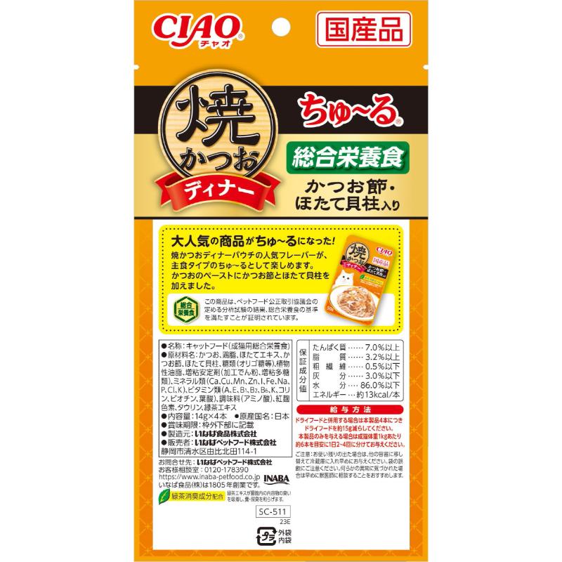[いなばペットフード(直送)]焼かつおディナーちゅ~る かつお節・ほたて貝柱入り 14g×4本 ※メーカー直送 ※発注単位・最低発注数量(混載50ケース以上)にご注意下さい