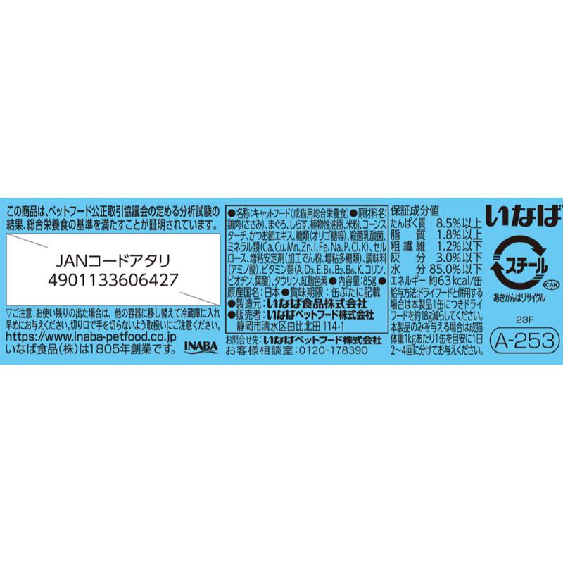 | 素材 | <原材料> 鶏肉(ささみ)、まぐろ、しらす、植物性油脂、米粉、コーンスターチ、かつお節エキス、糖類(オリゴ糖等)、殺菌乳酸菌、ミネラル類(Ca、Cu、Mn、Zn、l、Fe、Na、P、Cl、K)、セルロース、増粘安定剤(加工でん粉、増粘多糖類)、調味料(アミノ酸)、ビタミン類(A、D3、E、B1、B2、B6、K、コリン、ビオチン、葉酸)、タウリン、紅麹色素 <保証成分> たんぱく質8.5%以上、脂質1.8%以上、粗繊維1.2%以下、灰分3.0%以下、水分85.0%以下 <エネルギー> 約63kcal/缶 |
