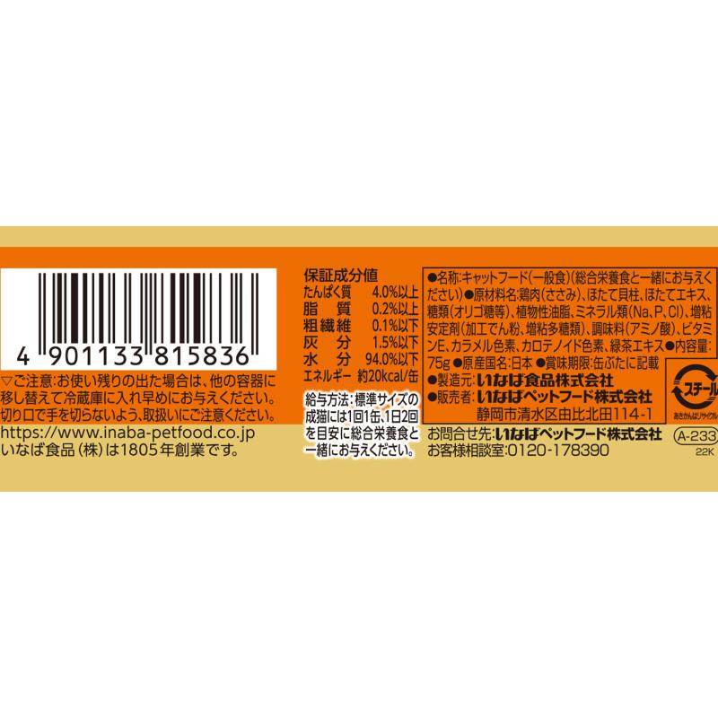 | 素材 | <原材料> 鶏肉(ささみ)、ほたて貝柱、ほたてエキス、糖類(オリゴ糖等)、植物性油脂、ミネラル類(Na、P、Cl)、増粘安定剤(加工でん粉、増粘多糖類)、調味料(アミノ酸)、ビタミンE、カラメル色素、カロテノイド色素、緑茶エキス <保証成分> たんぱく質4.0%以上、脂質0.2%以上、粗繊維0.1%以下、灰分1.5%以下、水分94.0%以下 <エネルギー> 約20kcal/缶 |