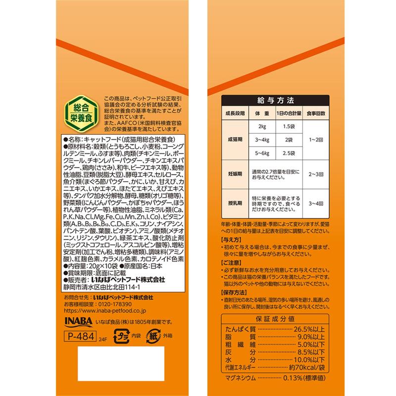 | 素材 | <原材料> 穀類(とうもろこし、小麦粉、コーングルテンミール、ふすま等)、肉類(チキンミール、ポークミール、チキンレバーパウダー、チキンエキスパウダー、鶏肉(ささみ)、和牛、ビーフエキス等)、動物性油脂、豆類(脱脂大豆)、酵母エキス、セルロース、魚介類(まぐろ節パウダー、かに、いか、甘えび、カニエキス、いかエキス、ほたてエキス、えびエキス等)、タンパク加水分解物、酵母、糖類(オリゴ糖等)、野菜類(にんじんパウダー、かぼちゃパウダー、ほうれん草パウダー等)、植物性油脂、ミネラル類(Ca、P、K、Na、Cl、Mg、Fe、Cu、Mn、Zn、I、Co)、ビタミン類(A、B1、B2、B6、B12、C、D3、E、K3、コリン、ナイアシン、パントテン酸、葉酸、ビオチン)、アミノ酸類(メチオニン、リジン、タウリン)、緑茶エキス、酸化防止剤(ミックストコフェロール、アスコルビン酸等)、増粘安定剤(加工でん粉、増粘多糖類)、調味料(アミノ酸)、紅麹色素、カラメル色素、カロテノイド色素 <保証成分> たんぱく質26.5%以上 脂質9.0%以上 粗繊維5.0%以下 灰分8.5%以下 水分10.0%以下 <エネルギー> 約70kcal/袋 |