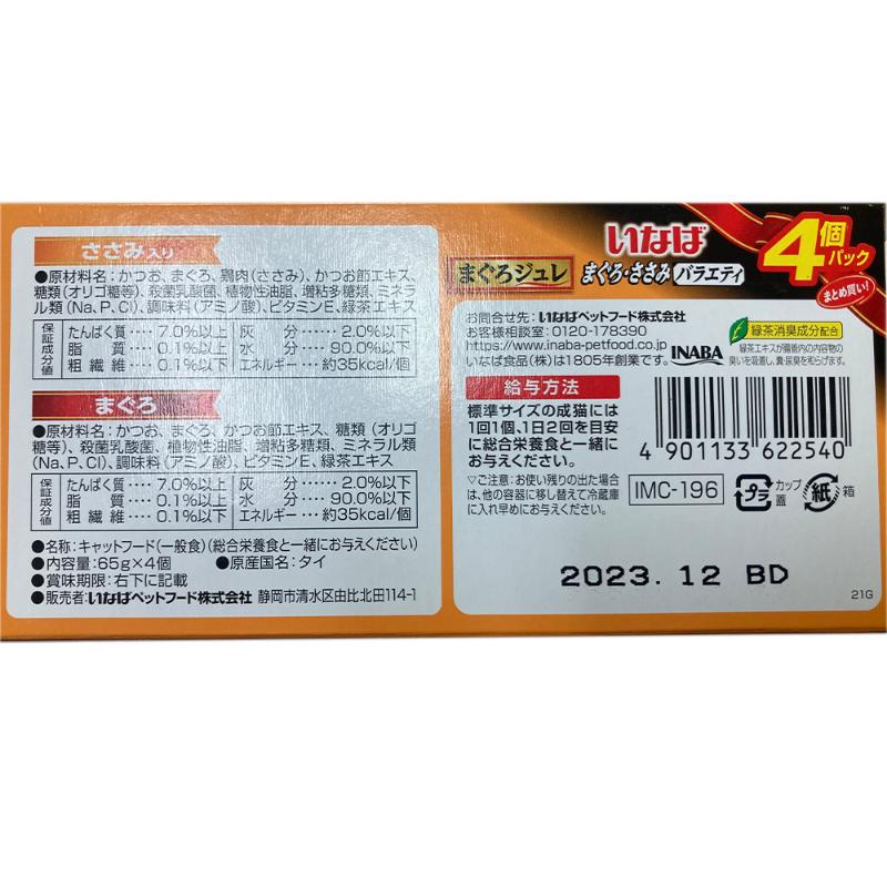 [いなばペットフード(直送)]いなば まぐろジュレ 乳酸菌入り まぐろ・ささみバラエティ 65g×4個パック ※メーカー直送 ※発注単位・最低発注数量(混載50ケース以上)にご注意下さい