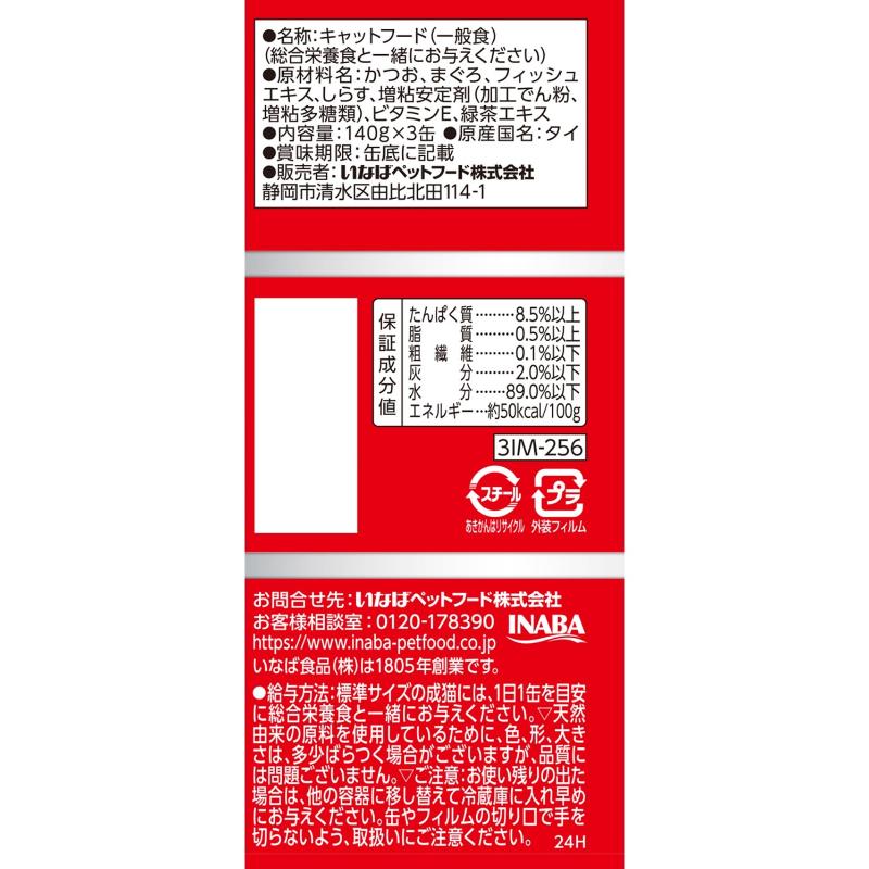 | 素材 | <原材料> かつお、まぐろ、フィッシュエキス、しらす、増粘安定剤(加工でん粉、増粘多糖類)、ビタミンE、緑茶エキス <保証成分> たんぱく質8.5%以上、脂質0.5%以上、粗繊維0.1%以下、灰分2.0%以下、水分89.0%以下 <エネルギー> 約50kcal/100g |