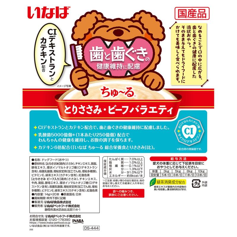 [いなばペットフード(直送)]歯と歯ぐきの健康維持に配慮ちゅ~る とりささみ・ビーフバラエティ 14g×20本 ※メーカー直送 ※発注単位・最低発注数量(混載50ケース以上)にご注意下さい【メーカーフェア5】