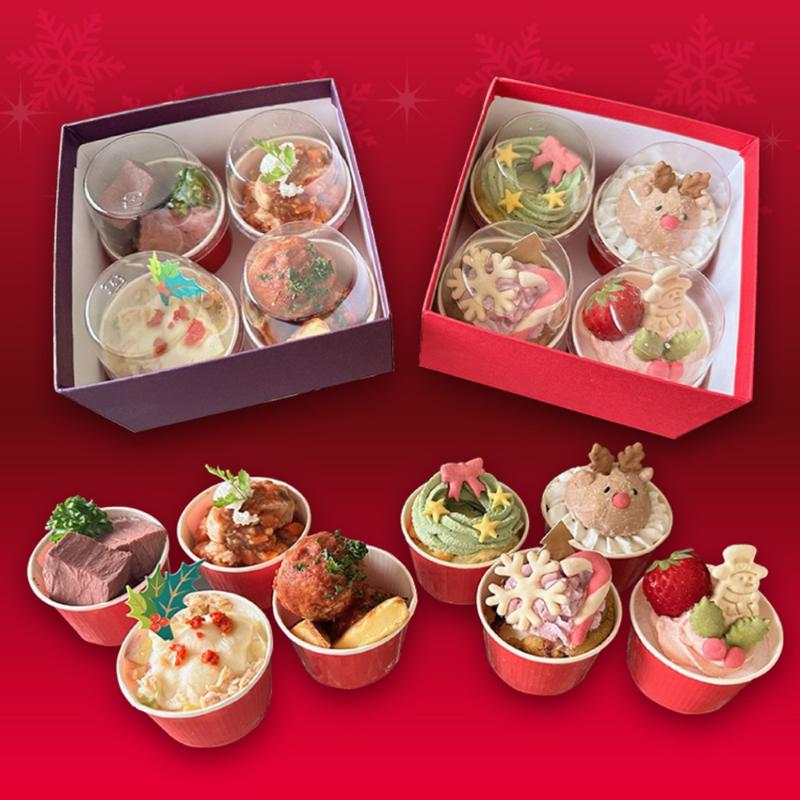 ごちそう4種&ミニケーキ4種、セットでお求めいただくと、おトクです。どちらも冷凍できるから、ちょっとずつ楽しめるよ!