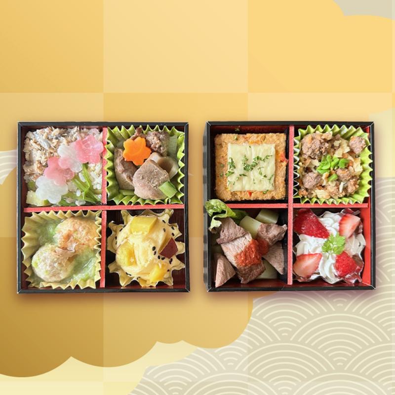 | 素材 | <原材料> ■和の段 [鮭のちらし寿司] 白米、鮭、さつまいも、おから、大根、しめじ、絹さや、ビーツ、ごま、ごま油 [鶏団子 野菜の餡かけ] 鶏ひき肉、白菜、えのき、大根、パプリカ、鶏卵、片栗粉 [猪肉のお煮しめ] 猪肉、大根、れんこん、小松菜、にんじん、くず粉 [さつまいも蒸しケーキ] 薄力粉、さつまいも、鶏卵、フラクトオリゴ糖、なたね油、ベーキングパウダー、ごま ■洋の段 [チーズのせポークミートローフ] 豚ひき肉、おから、かぼちゃ、きゃべつ、にんじん、モッツアレラチーズ、パセリ [馬肉のパスタ・ボロネーゼ] 馬肉、にんじん、きゃべつ、パスタ、グリーンピース、オリーブオイル [ビーフステーキ ポテト添え] 牛もも肉、牛ハツ、じゃがいも、トマト水煮、サニーレタス、オリーブオイル [いちごのマドレーヌ] いちご、全粒粉、鶏卵、米粉、カテージチーズ、なたね油、フラクトオリゴ糖、ベーキングパウダー、スキムミルク、ヨーグルト、セルフィーユ <エネルギー> 707kcal |