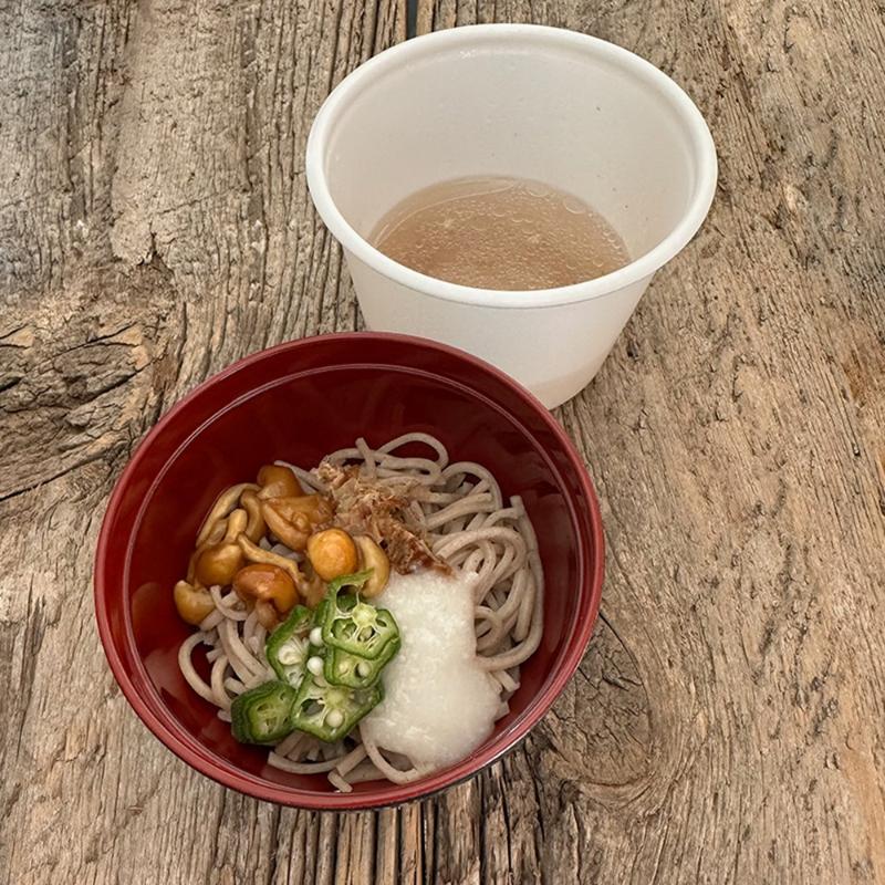 ・蕎麦は十割蕎麦を使用し、食べやすく短めにカットしてあります。さらに具材にはなめこ、山芋、オクラがトッピングされています。