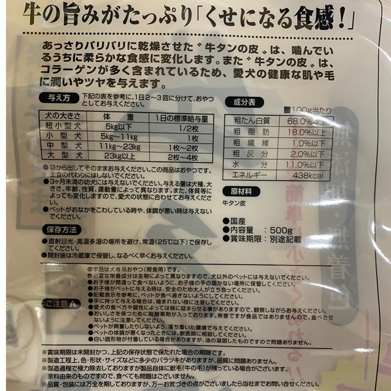 | 素材 | <原材料> 牛タン皮 <保証成分> 粗たん白質68.0%以上、粗脂肪18.0%以上、粗繊維1.0%以下、粗灰分2.0%以下、水分11.0%以下 <エネルギー> 438kcal/100g |