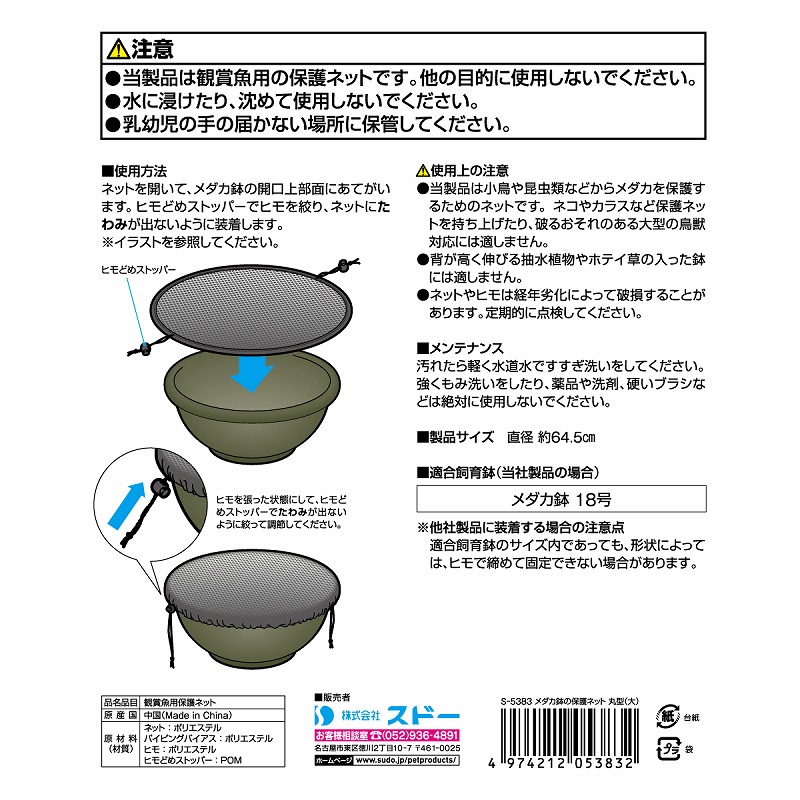 | 注意事項 | ・当製品は観賞魚用の保護ネットです。他の目的に使用しないでください。 ・水に浸けたり、沈めて使用しないでください。 ・当製品は小鳥や昆虫類などからメダカを保護するためのネットです。ネコやカラスなど保護ネットを持ち上げたり、破る恐れのある大型の鳥獣対応には適しません。 ・ネットやヒモは経年劣化によって破損することがあります。定期的に点検してください。 ・背が高く伸びる抽水植物やホテイ草の入った鉢には適しません。 ・他社製品に使用する場合、適合飼育鉢のサイズ内であっても、形状によっては、ヒモで締めて固定できない場合があります。 |