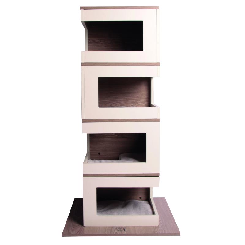 ・狭いところが大好きなねこちゃんが安心してくつろげる隠れ家のようなハウスが縦に4段並んだマンション型キャットタワー。多頭飼いにもおすすめです。