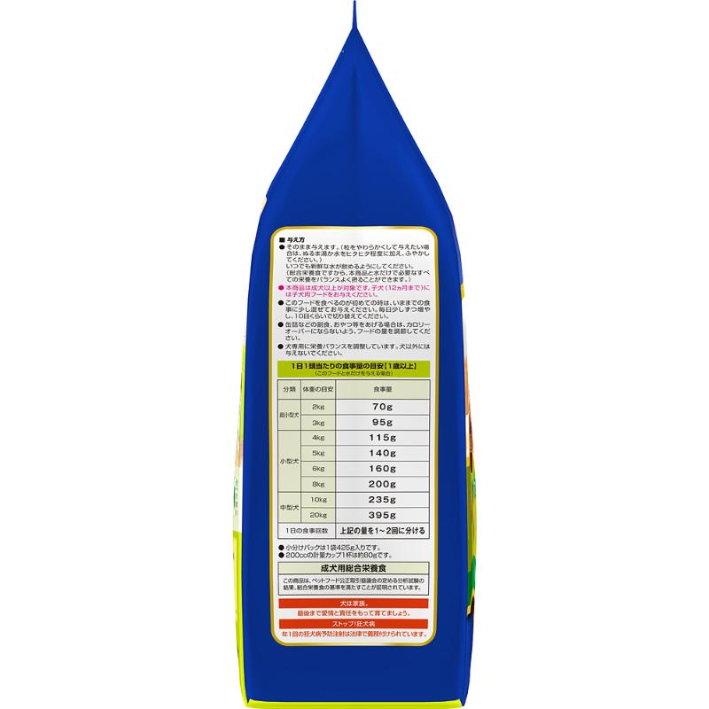 | 注意事項 | ・犬専用に栄養バランスを調整しています。犬以外には与えないでください。 ・本商品は成犬以上が対象です。子犬(12ヶ月まで)には子犬用フードをお与えください。 ・天然素材パウダーをコーティングしていますので、粒の色調は若干バラつく場合があります。また具材の色、形、大きさに若干のバラつきがありますが、品質に問題はありません。 |