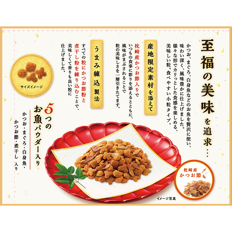 愛猫の大好きな5つのお魚パウダーを配合。2種類の食物繊維を配合し毛玉に配慮。マグネシウムの量を調整することで下部尿路の健康維持にも配慮。枕崎産かつお節を添えて風味豊かに。
