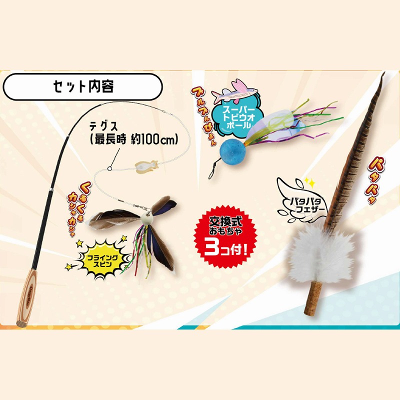 ・おもちゃは高速回転とキラカシャ音で空中を飛び回るフライングスピン、スーパーボールの弾性で床で飛び跳ねたり、キラカシャ羽を震わせて誘うスーパートビウオボール、長い羽根を使ったパタパタフェザーはテグスを取り外して竿へ直接挿す特別仕様。