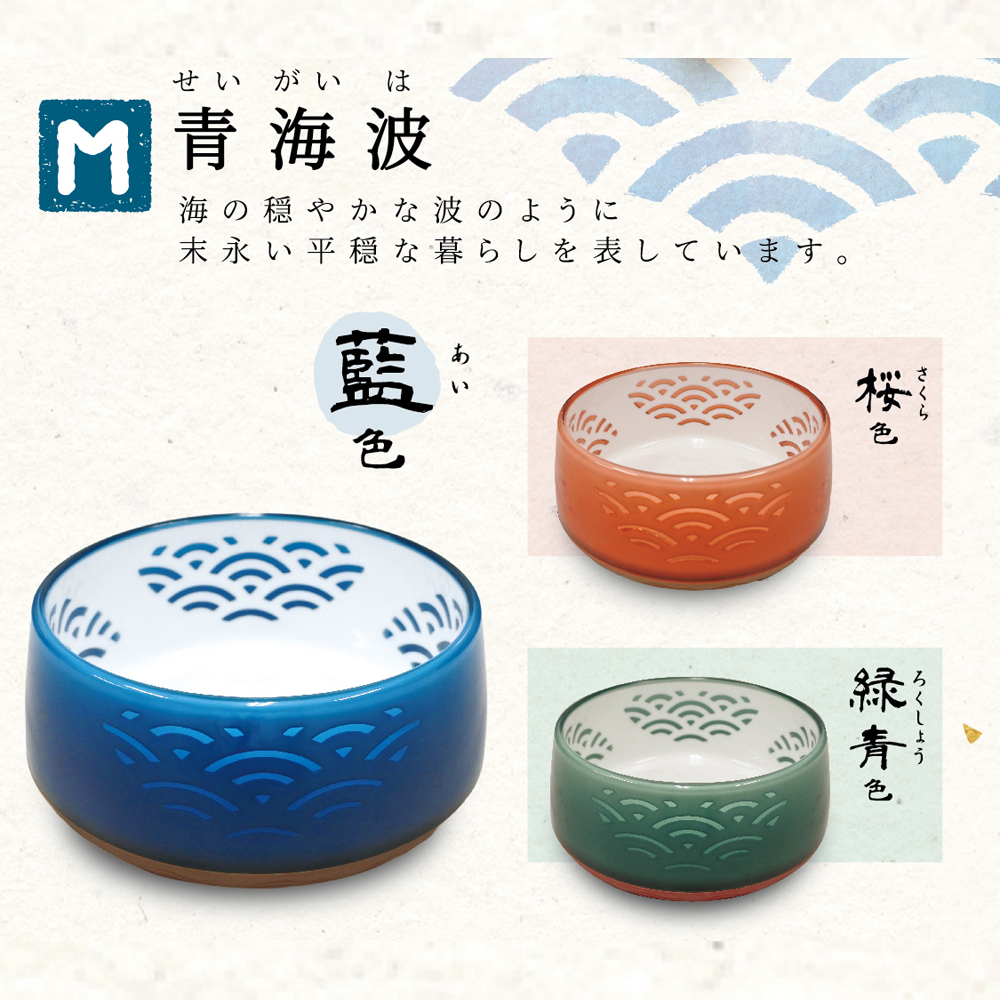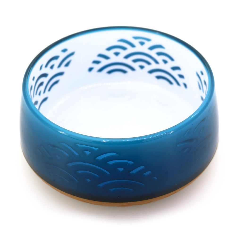 ・日本の伝統文様「青海波(海の穏やかな波がモチーフ。平穏な暮らしの意)」と伝統色「藍色」を織り交ぜ、凛とした風合いに仕上げたペット用食器です。