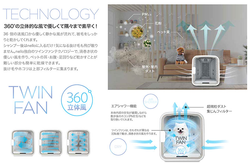 nello独自のツインファンテクノロジーで、渦巻き状の優しい風を作り、ペットの耳・お腹・足回りなど乾かすことが難しい部分も簡単に乾燥できます。