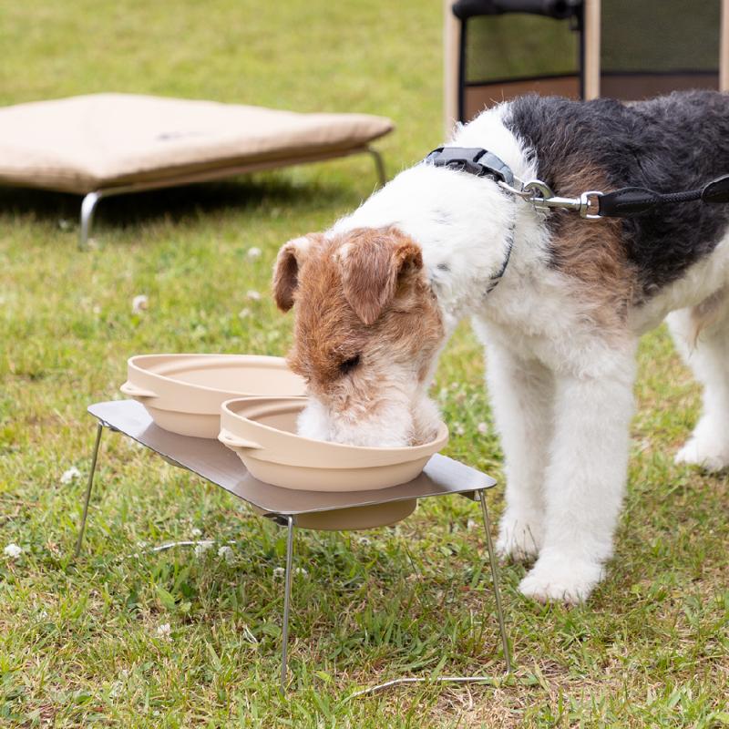 お出かけ先のお食事タイムも快適に過ごせる、食べやすい高さの食器台と食器セットです。