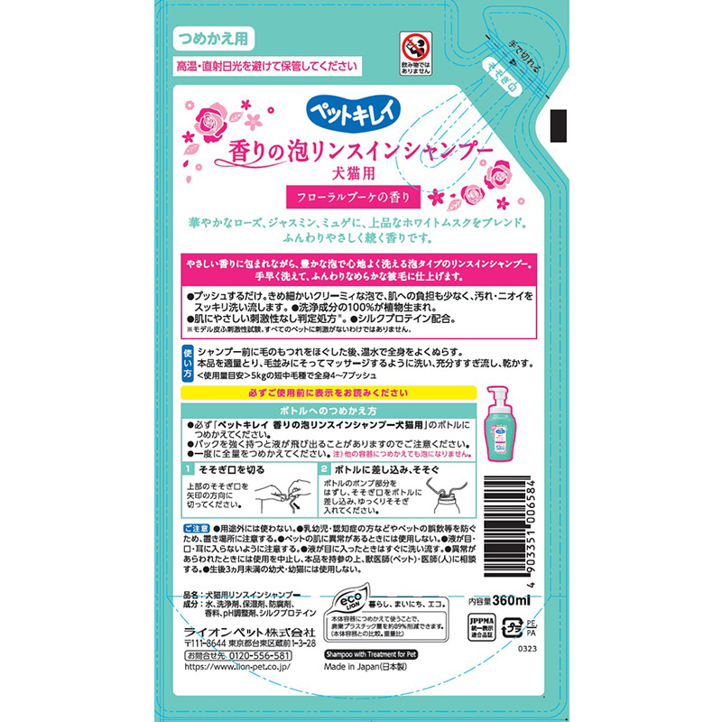 【アウトレット】[ライオン]ペットキレイ 香りの泡リンスインシャンプー 犬猫用 つめかえ 360ml