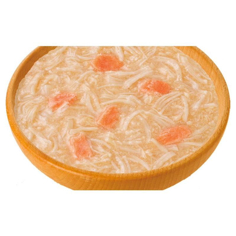 | 素材 | <原材料> 鶏肉(ささみ)、紅鮭、チキンエキス、糖類(オリゴ糖等)、酵母エキス、植物性油脂、増粘安定剤(増粘多糖類、加工でん粉)、ミネラル類(Na、P、Cl)、調味料(アミノ酸)、ビタミンE、紅麹色素、緑茶エキス <保証成分> たんぱく質8.5%以上、脂質0.5%以上、粗繊維0.1%以下、灰分1.1%以下、水分89.8%以下 <エネルギー> 約25kcal/袋 |