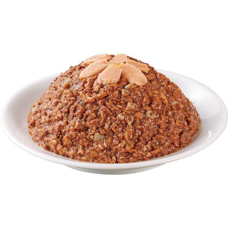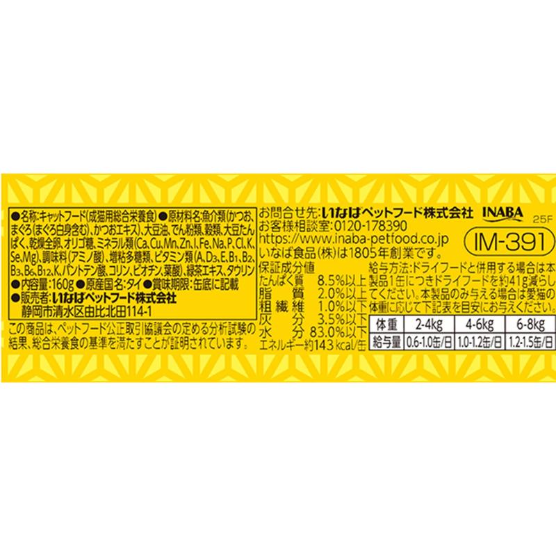 | 素材 | <原材料> 魚介類(かつお、まぐろ(まぐろ白身含む)、かつおエキス)、大豆油、でん粉類、穀類、大豆たんぱく、乾燥全卵、オリゴ糖、ミネラル類(Ca、Cu、Mn、Zn、I、Fe、Na、P、Cl、K、Se、Mg)、調味料(アミノ酸)、増粘多糖類、ビタミン類(A、D3、E、B1、B2、B3、B6、B12、K、パントテン酸、コリン、ビオチン、葉酸)、緑茶エキス、タウリン <保証成分> たんぱく質8.5%以上、脂質2.0%以上、粗繊維1.0%以下、灰分3.5%以下、水分83.0%以下 <エネルギー> 約143kcal/缶 |