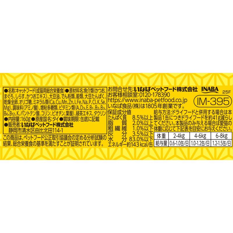 | 素材 | <原材料> 魚介類(かつお、まぐろ、しらす、かつおエキス)、大豆油、でん粉類、穀類、大豆たんぱく、乾燥全卵、オリゴ糖、ミネラル類(Ca、Cu、Mn、Zn、I、Fe、Na、P、Cl、K、Se、Mg)、調味料(アミノ酸)、増粘多糖類、ビタミン類(A、D3、E、B1、B2、B3、B6、B12、K、パントテン酸、コリン、ビオチン、葉酸)、緑茶エキス、タウリン <保証成分> たんぱく質8.5%以上、脂質2.0%以上、粗繊維1.0%以下、灰分3.5%以下、水分83.0%以下 <エネルギー> 約143kcal/缶 |