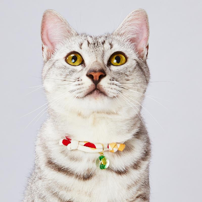 トンボ玉付きの高級感ある和柄猫首輪。力が加わると外れる安心仕様のマグネット式で取付け簡単。