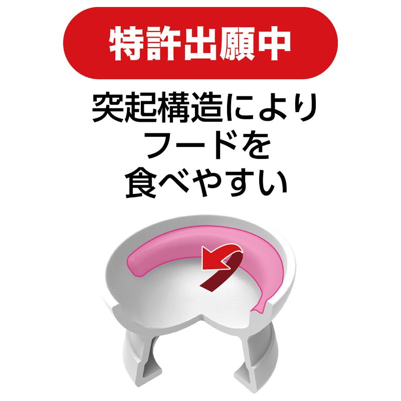 突起形状によりフードを食べこぼしにくい(特許出願中)傾斜により、フードが手前に集まりやすく残しにくい形状。