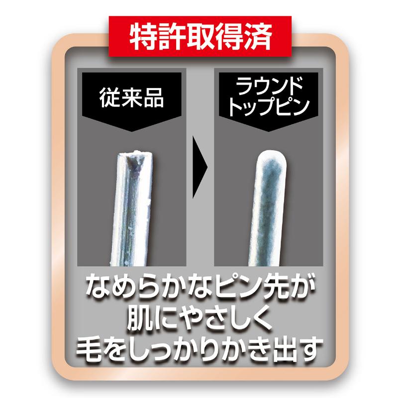 特許技術で先端が丸く加工されており、皮膚を傷つける事なく、効率よく整毛とムダ毛の除去がおこなえます。ピンには国産ステンレスSUS304を使用。