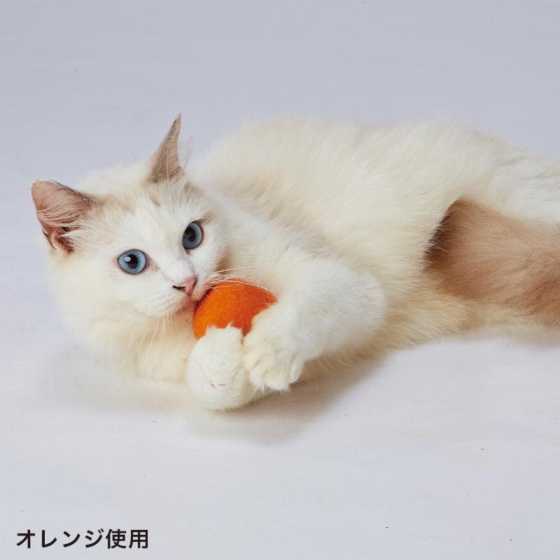 天然素材のウールを使用した玩具。軽いので触るとコロコロ転がる。やわらかく、ツメが引っかかりやすい。