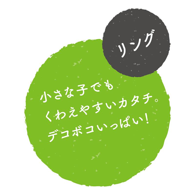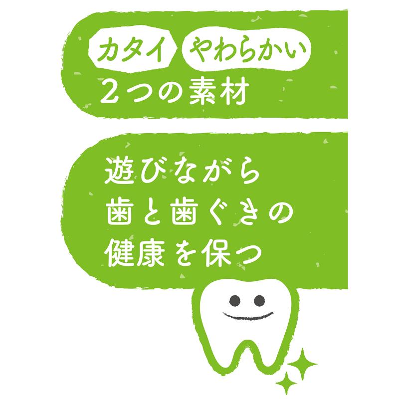 かんで楽しむ玩具。かたい・やわらかいの2種の素材を楽しめる。小さな子でもくわえやすいカタチ。でこぼこいっぱい!