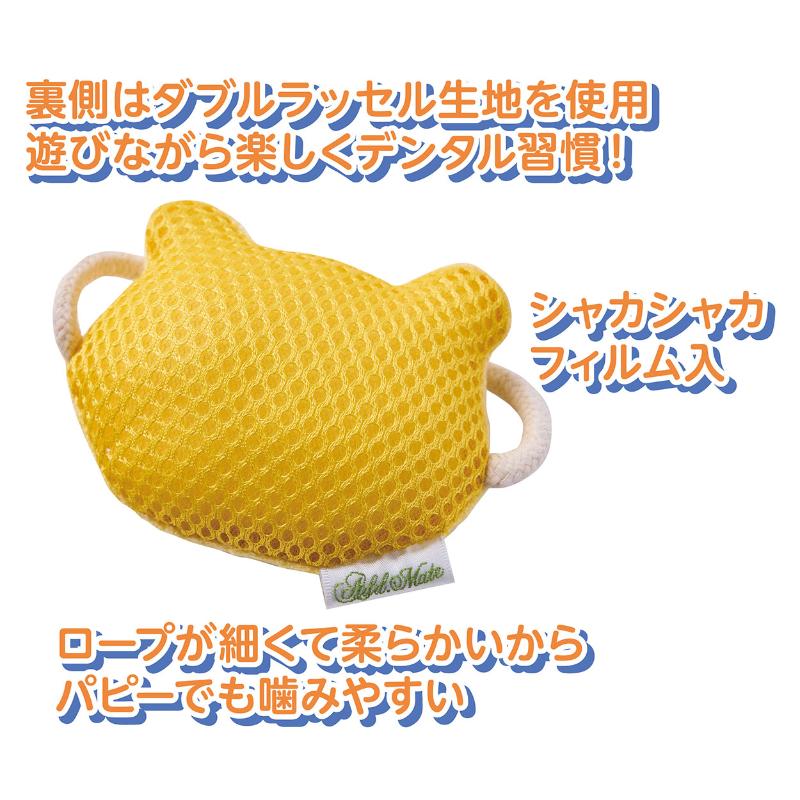 ・表面に噛みやすいパイル生地と、歯磨き効果のあるダブルラッセル生地・ロープを採用。