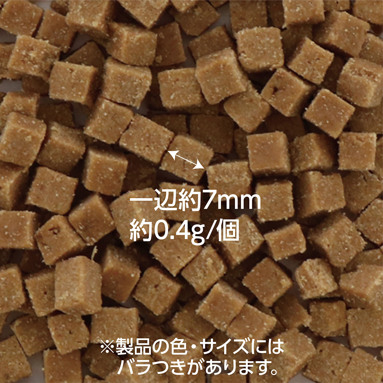 | 素材 | <原材料> 肉類(鶏)、小麦粉、脱脂大豆、でんぷん類、小麦たん白、砂糖、アマニ油、植物性油脂、食塩、乳酸菌、納豆菌、酵母菌の共棲発酵産物、オリゴ糖、グリセリン、ミネラル類(カルシウム、鉄、塩素、カリウム、マンガン、亜鉛、銅、ヨウ素、コバルト、ケイ素)、プロピレングリコール、ソルビトール、リン酸塩(Na)、保存料(ソルビン酸K)、ビタミン類(A、B2、B12、D、E、コリン)、酸化防止剤(エリソルビン酸Na)、メチオニン <保証成分> 粗たん白質14.0%以上、粗脂肪5.0%以上、粗繊維1.0%以下、粗灰分6.5%以下、水分35.0%以下、ナトリウム0.7g以下 <エネルギー> 291kcal/100g |