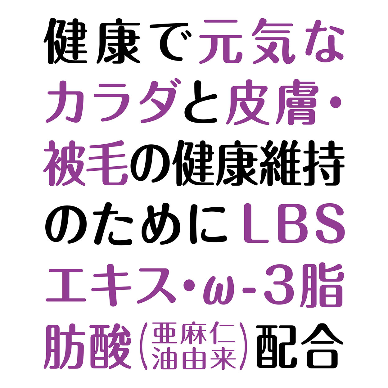 元気なカラダづくりと皮膚被毛の健康維持に配慮し、LBSエキスとω‐3脂肪酸配合(亜麻仁油由来)。