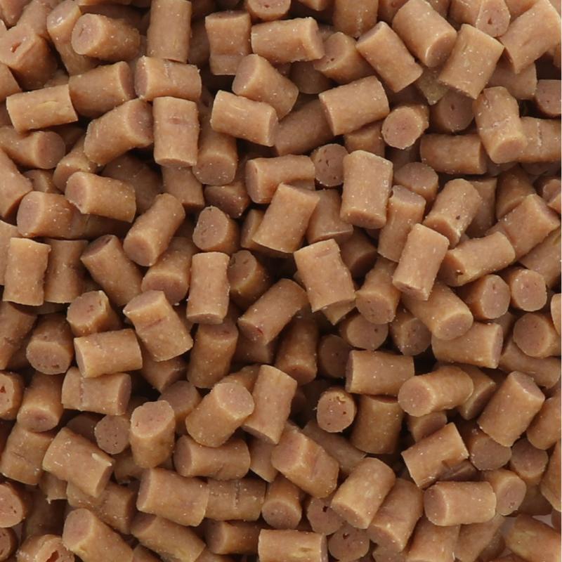 | 素材 | <原材料> 肉類(鶏、豚レバー)、脱脂大豆、砂糖、でんぷん類、オリゴ糖、小麦粉、アマニ油、酵母、乳酸菌(KT-11株(熱処理済))、グルコサミン、加工でんぷん、グリセリン、ミネラル類(カルシウム、カリウム、リン、亜鉛、鉄、銅、マンガン、ヨウ素、コバルト、ケイ素、塩素)、ソルビトール、pH調整剤、セルロース、リン酸塩(Na)、ビタミン類(A、B2、B12、D、E、コリン)、メチオニン <保証成分> たんぱく質19.0%以上、脂質6.5%以上、粗繊維1.0%以下、灰分6.5%以下、水分30.0%以下、ナトリウム0.4g以下 <エネルギー> 312kcal/100g |