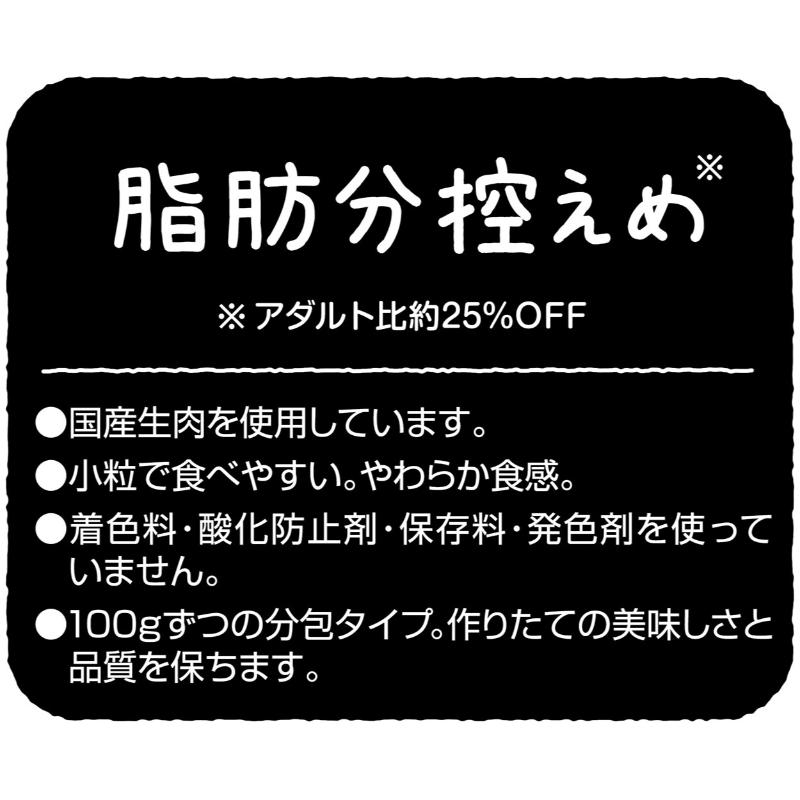 | 素材 | <原材料> 肉類(鶏、牛、豚レバー)、脱脂大豆、砂糖、でんぷん類、オリゴ糖、小麦粉、アマニ油、酵母、乳酸菌(KT-11株(熱処理済))、グルコサミン、加工でんぷん、グリセリン、ミネラル類(カルシウム、カリウム、リン、亜鉛、鉄、銅、マンガン、ヨウ素、コバルト、ケイ素、塩素)、ソルビトール、pH調整剤、セルロース、リン酸塩(Na)、ビタミン類(A、B2、B12、D、E、コリン)、メチオニン <保証成分> たんぱく質19.5%以上、脂質5.0%以上、粗繊維1.0%以下、灰分6.5%以下、水分30.0%以下、ナトリウム0.4g以下 <エネルギー> 307kcal/100g |