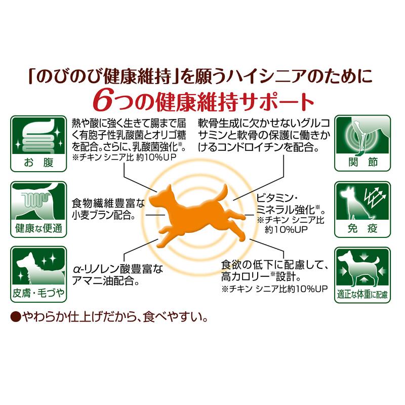 | 素材 | <原材料> 肉類(鶏・鶏ササミ・鶏レバー)、小麦粉、脱脂大豆、植物性油脂、糖類、小麦たん白、小麦ブラン、オリゴ糖、野菜類(トマト・にんじん)、アマニ油、酵母、乳酸菌(ラクリス)、サメ軟骨抽出物(コンドロイチン含有)、加工でんぷん、グリセリン、プロピレングリコール、ソルビトール、ミネラル類(カルシウム・塩素・カリウム・鉄・亜鉛・リン・ケイ素・銅・ヨウ素・マンガン・コバルト)、膨張剤、リン酸塩(Na)、ビタミン類(A・B2・B12・D・E・コリン)、グルコサミン、メチオニン <保証成分> たん白質18.0%以上、脂質8.0%以上、粗繊維1.0%以下、灰分6.0%以下、水分30.0%以下、ナトリウム0.7g以下 <エネルギー> 322kcal/100g |