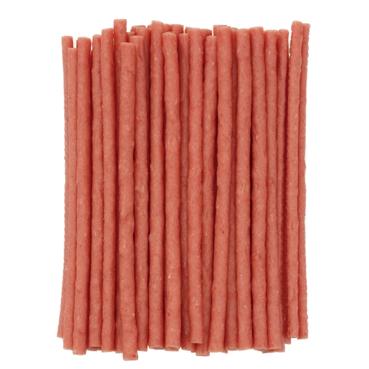 | 素材 | <原材料> 肉類(鶏・鶏ササミ・ラム)、でんぷん類、米粉、食塩、グリセリン、炭酸Ca、プロピレングリコール、乳化剤、pH調整剤、保存料(ソルビン酸K)、リン酸塩(Na)、発色剤(亜硝酸Na) <保証成分> たん白質14.0%以上、脂質9.0%以上、粗繊維0.1%以下、灰分6.0%以下、水分28.0%以下、ナトリウム1.0g以下 <エネルギー> 309kcal/100g |