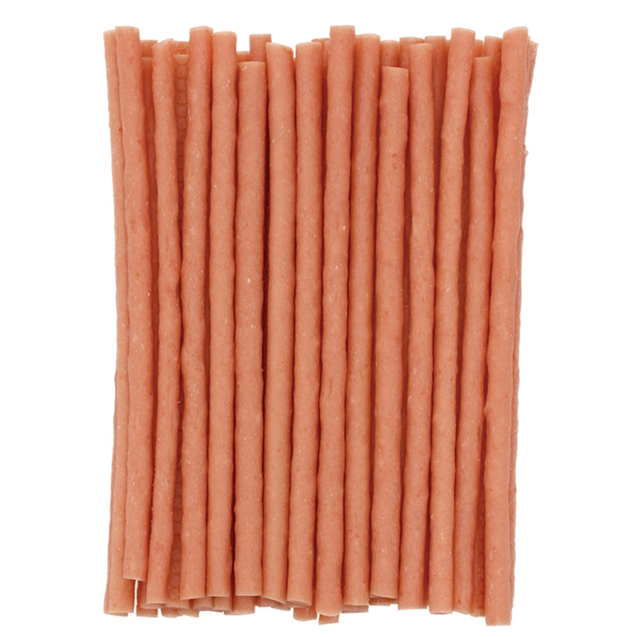 | 素材 | <原材料> 肉類(鶏・鶏ササミ)、でんぷん類、米粉、食塩、グリセリン、炭酸Ca、プロピレングリコール、乳化剤、pH調整剤、保存料(ソルビン酸K)、リン酸塩(Na)、発色剤(亜硝酸Na) <保証成分> たん白質16.5%以上、脂質4.0%以上、粗繊維0.1%以下、灰分6.0%以下、水分28.0%以下、ナトリウム1.0g以下 <エネルギー> 284kcal/100g |