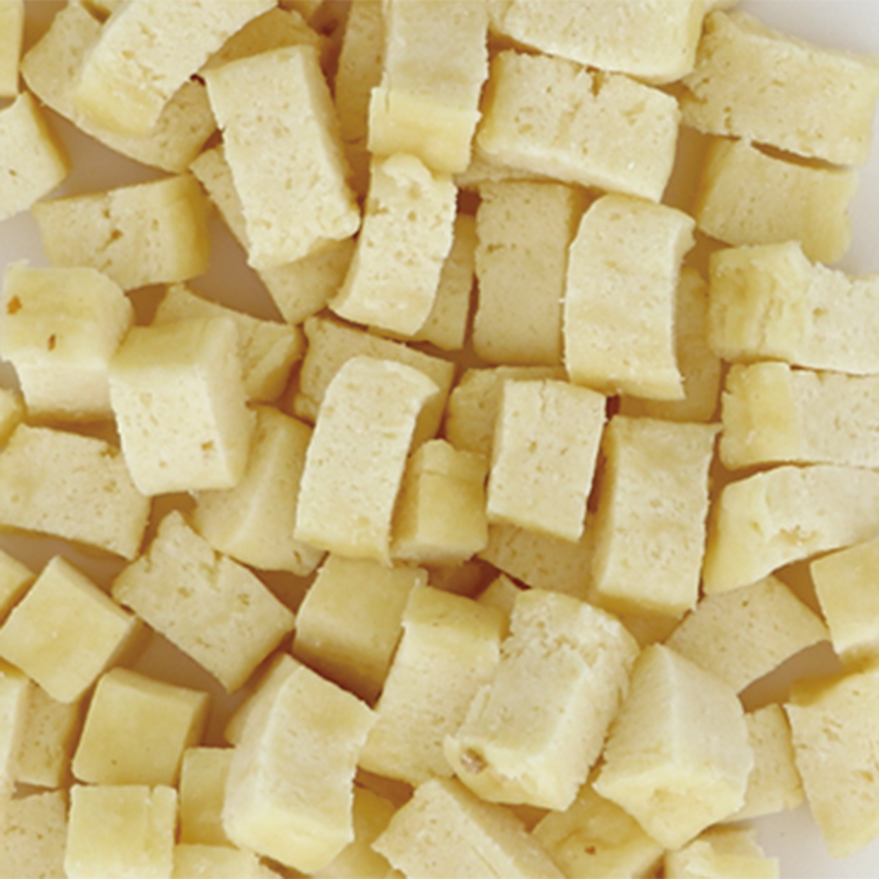 ・お腹の健康維持に生きたまま腸まで届く乳酸菌、オリゴ糖、食物繊維配合のキューブ型おやつです。