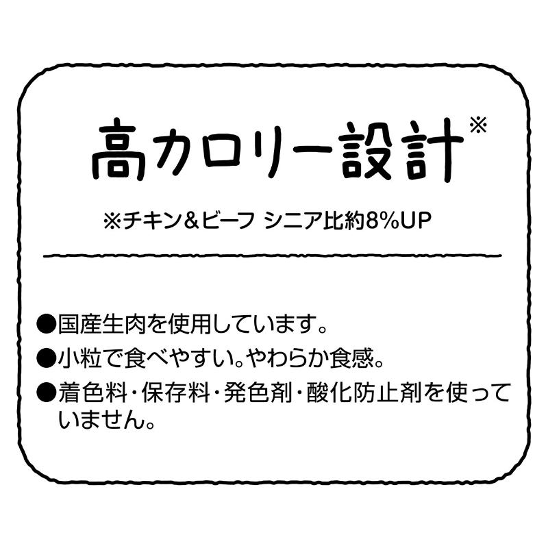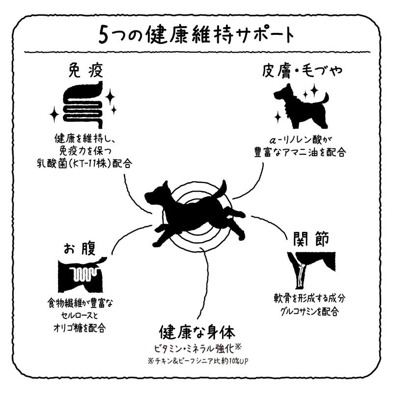 生肉(チキン&ビーフ)を100%使用(※使用肉原料として)した国産プレミアムドッグフード。ハイシニアのための5つの健康維持サポート。