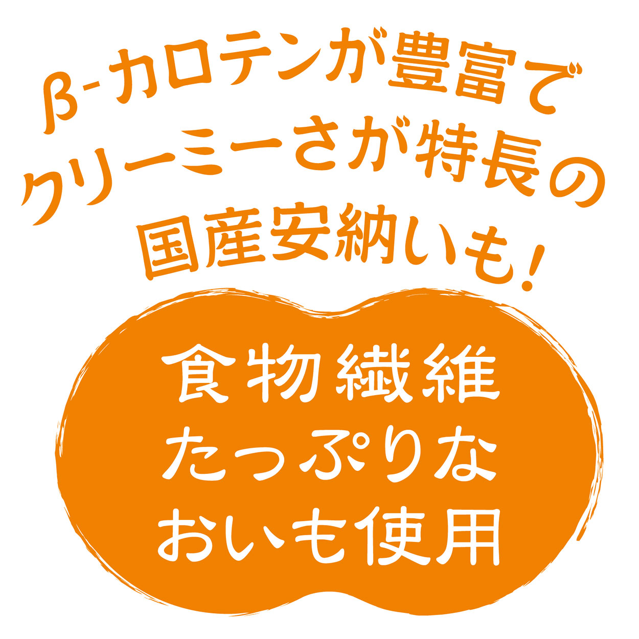 | 素材 | <原材料> さつまいも(安納いも・他)、小麦粉、でんぷん類、砂糖、小麦たん白、ラード、グリセリン、プロピレングリコール、リン酸塩(Na)、炭酸Ca、ソルビトール、保存料(ソルビン酸K)、香料、酸化防止剤(エリソルビン酸Na)、着色料(β‐カロテン・黄5号・赤102号・黄4号・赤106号) <保証成分> たん白質6.5%以上、脂質1.0%以上、粗繊維1.0%以下、灰分4.5%以下、水分34.0%以下 ナトリウム0.7g以下 <エネルギー> 277Kcal/100g |