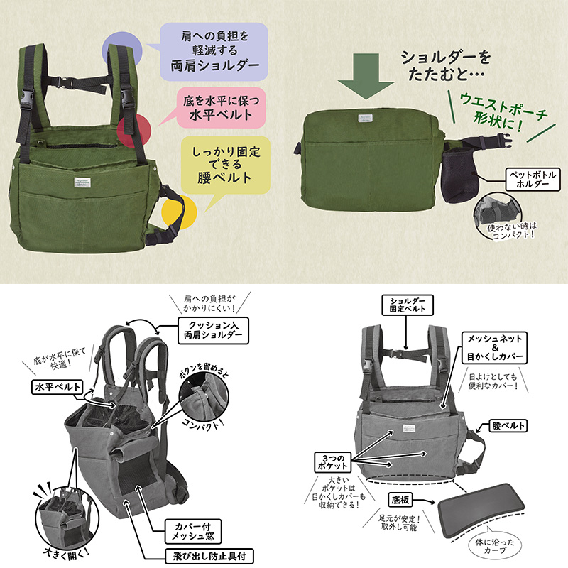 抱っこ感覚で使えるキャリーバッグ。底を水平に保つ水平ベルトでお出かけ中もわんちゃん快適。両肩ショルダー仕様で肩への負担がかかりにくく、腰ベルトでしっかり固定できる。キャリーバッグとして使用しない時はウェストポーチ形状で、お散歩中も両手が使えて便利。超小型犬~小型犬向き。