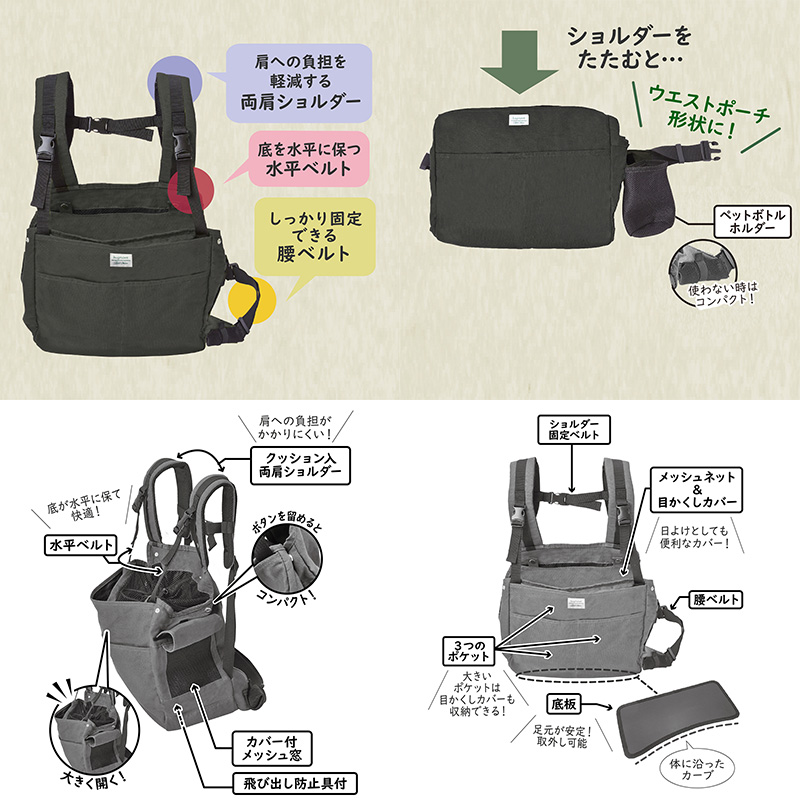抱っこ感覚で使えるキャリーバッグ。底を水平に保つ水平ベルトでお出かけ中もわんちゃん快適。両肩ショルダー仕様で肩への負担がかかりにくく、腰ベルトでしっかり固定できる。キャリーバッグとして使用しない時はウェストポーチ形状で、お散歩中も両手が使えて便利。超小型犬~小型犬向き。